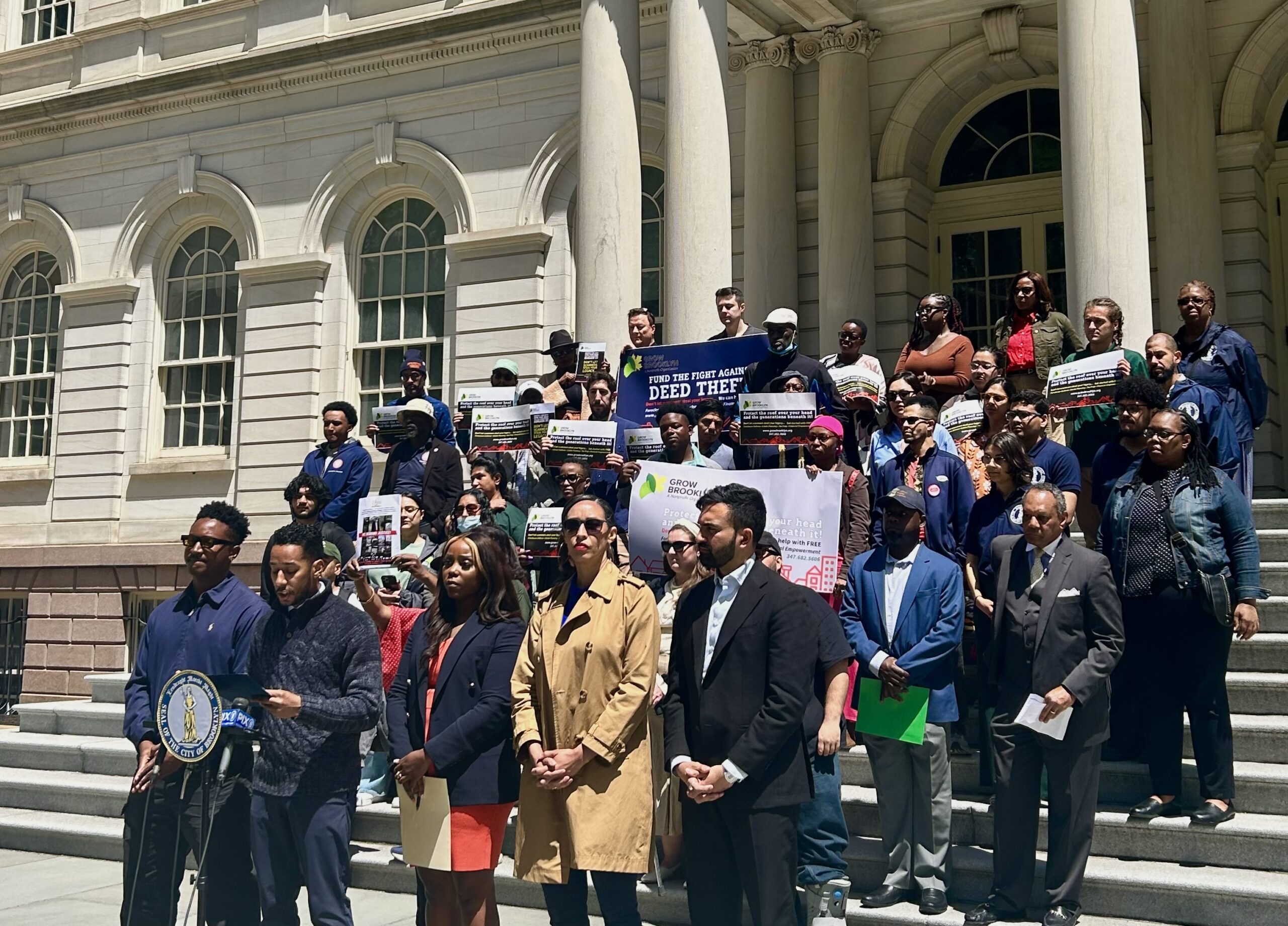 New York, NY –Today, Brooklyn Borough President Antonio Reynoso, NYC Council Members and Brooklyn Delegation Co-Chairs Chi Ossé and Farah Louis, and NYC Council Member Sandy Nurse rallied with advocates and homeowners at City Hall to demand a major investment into the fight against deed theft as part of the upcoming Fiscal Year 2026 budget. Deed theft, the fraudulent acquisition of property without a homeowner’s knowledge or consent, has become a rampant issue in Central and Eastern Brooklyn where there is a large concentration of older homeowners and homeowners of color.