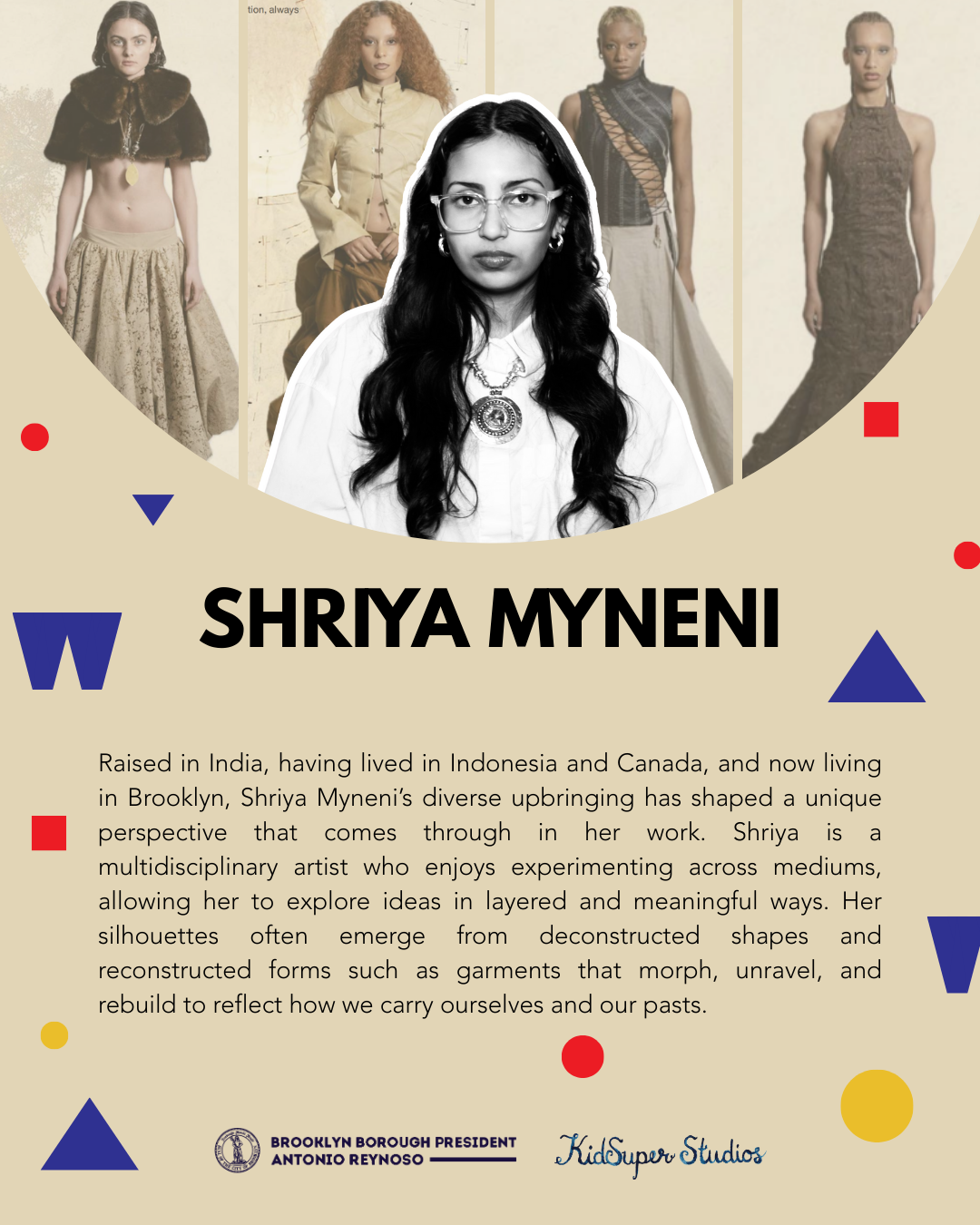 Raised in India, having lived in Indonesia and Canada, and now living in Brooklyn, Shriya Myneni’s diverse upbringing has shaped a unique perspective that comes through in her work. Shriya is a self-taught multidisciplinary artist who enjoys experimenting across mediums, allowing her to explore ideas in layered and meaningful ways. Her silhouettes often emerge from deconstructed shapes and reconstructed forms such as garments that morph, unravel, and rebuild to reflect how we carry ourselves and our pasts.